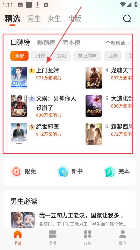 1、在书城页面,可浏览口碑榜等榜单,点击感兴趣的书籍,进入书籍详情页啦。