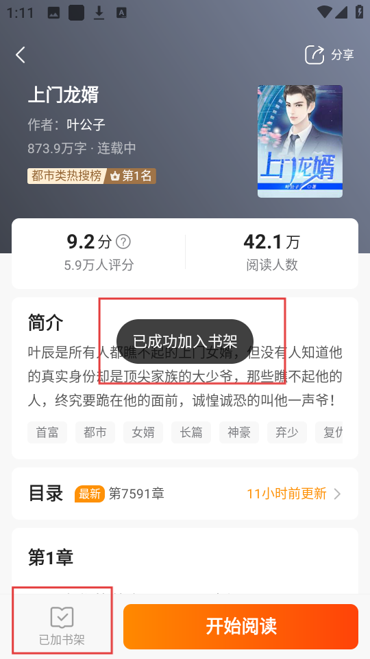 3、加入书架后,会显示已成功加入书架的提示,方便后续查找阅读啦。