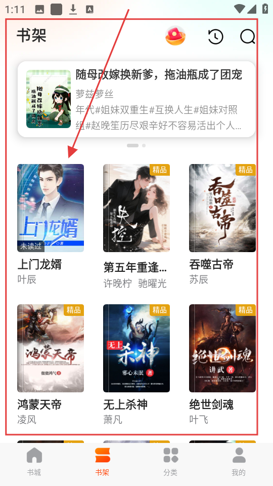 4、在书架页面,可查看已加入的书籍,如上门龙婿等,随时可点击阅读哦。