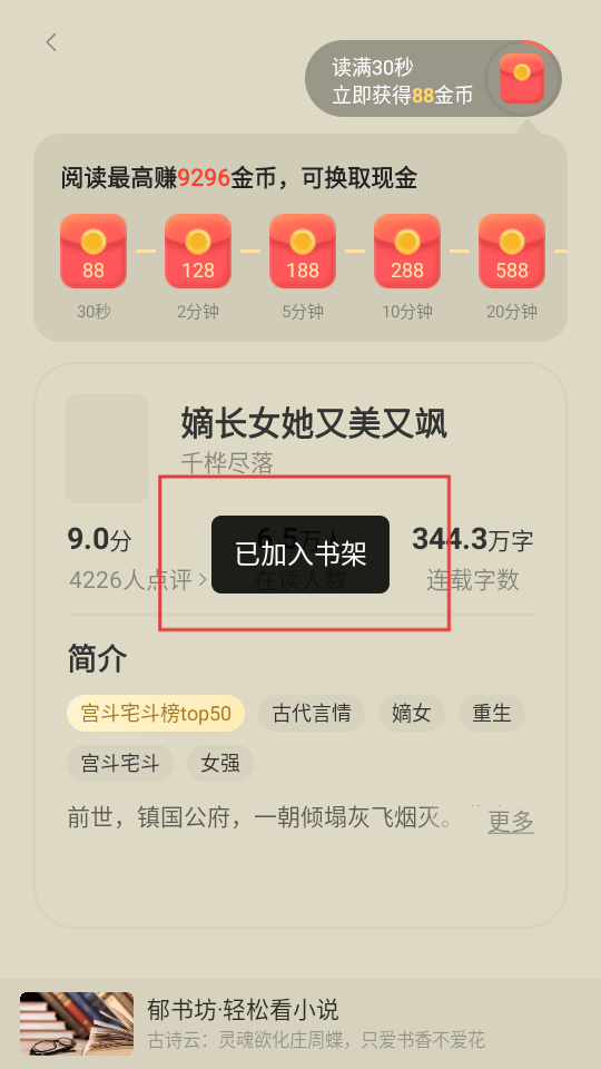 3、点击加入书架后,会提示已加入书架,说明操作成功啦。