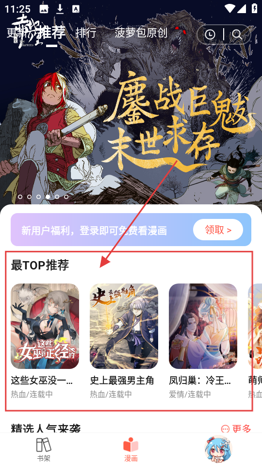 1、在首页最TOP推荐里,有【这些女巫没一个正经的】等漫画,点击就能进入详情页开始阅读啦。