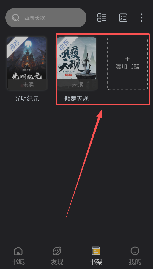 2、把自己在追的书集中起来,只需进入“书架”,点击“添加书籍”进行搜索,例如找到永夜君王,添加后它就会出现在你的书架列表中。