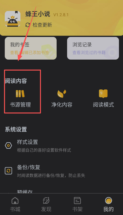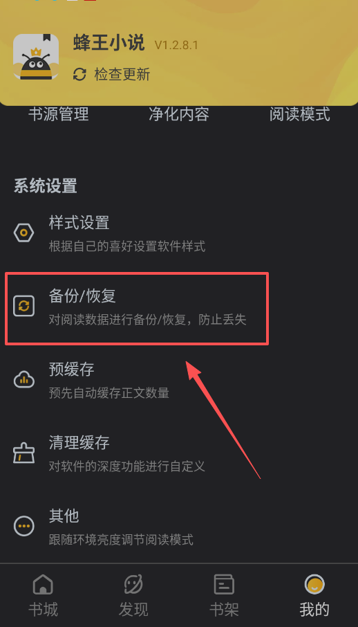 4、在“我的”页面进入“系统设置”,你可以进行“备份/恢复”操作,也能设置阅读模式与净化规则,从而打造一个专属的阅读环境。
