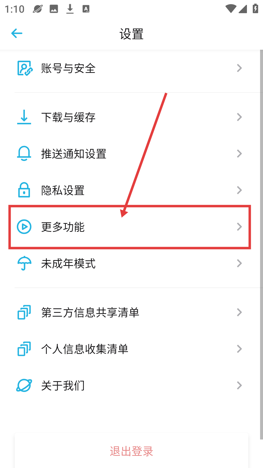 2、在设置界面点击【更多功能】,进入更多功能界面,准备添加小组件啦。