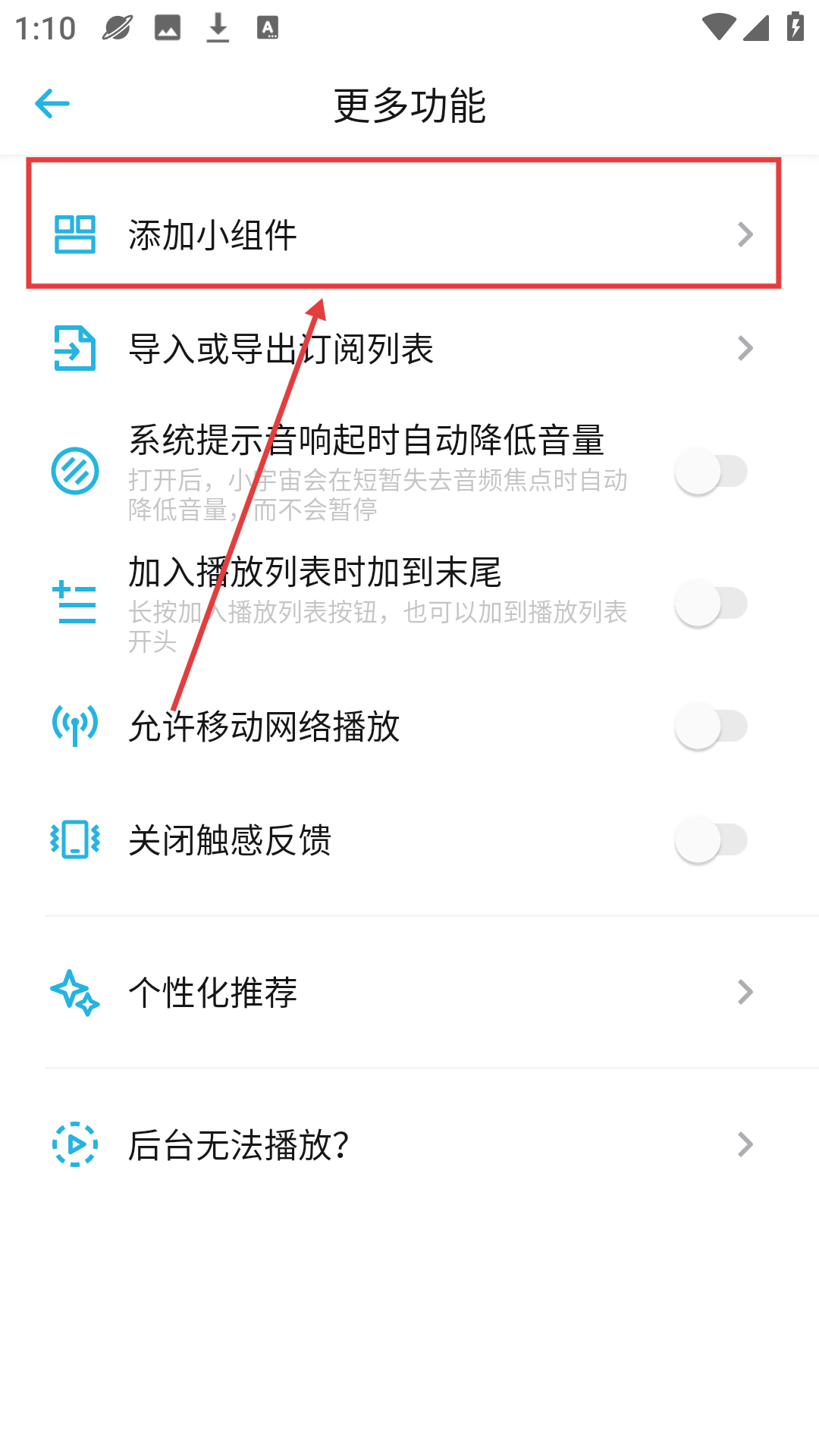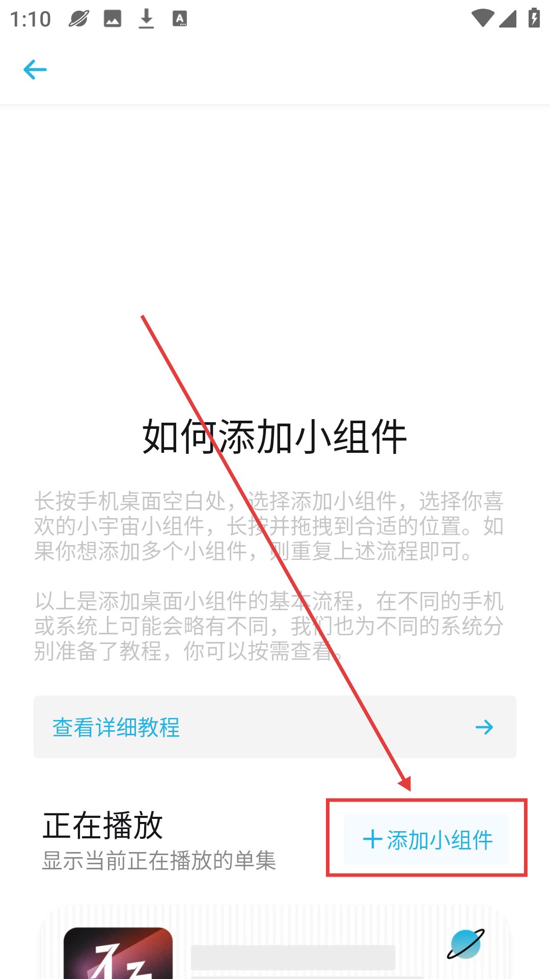 4、在添加界面点击【+添加小组件】,即可按照流程添加小宇宙小组件,方便快速访问啦。