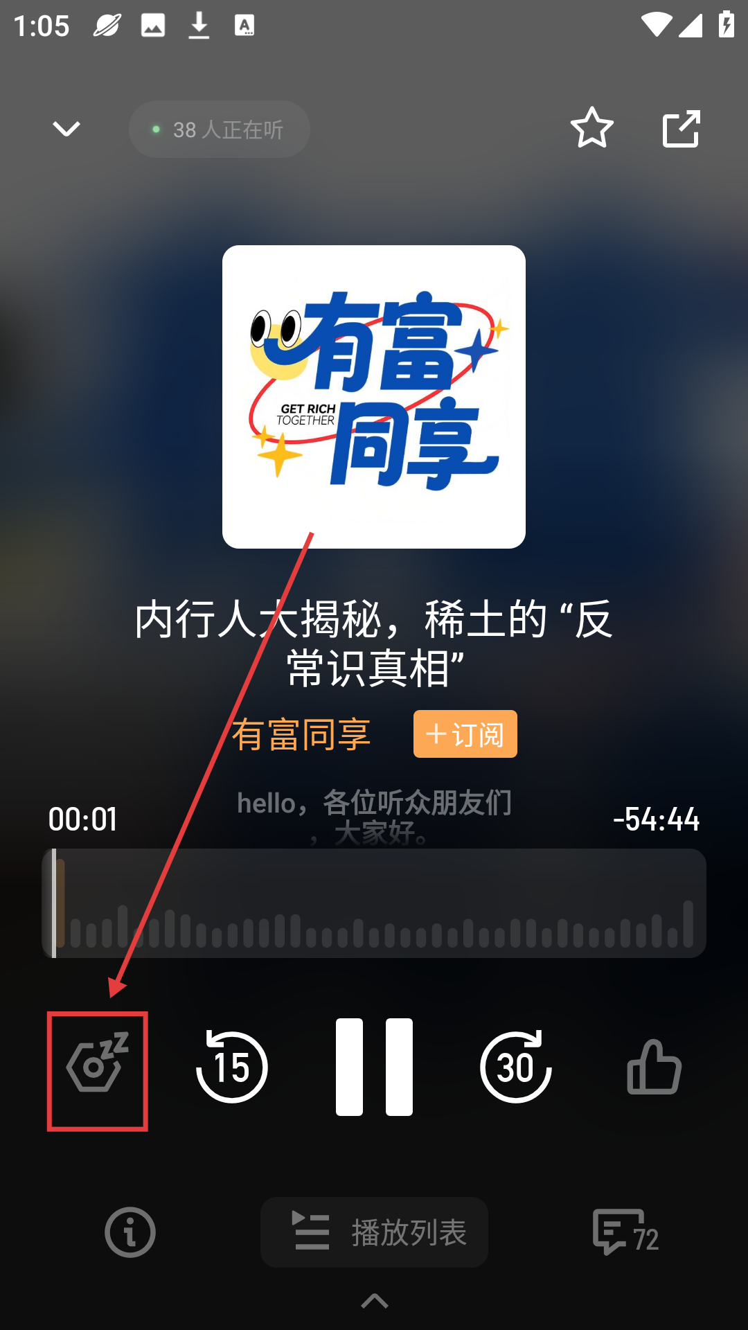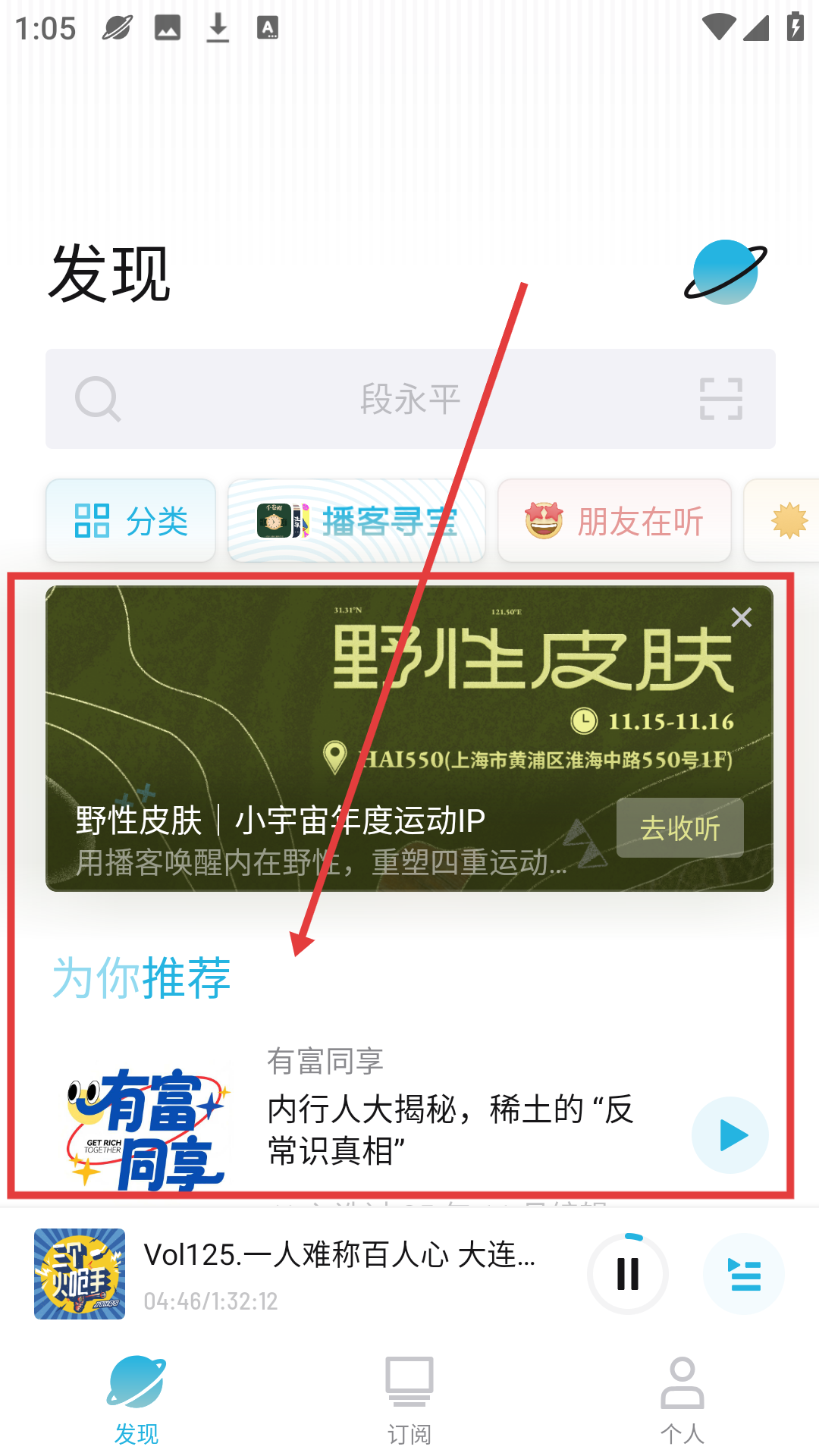 1、在发现页面,选择【为你推荐】的播客内容,点击进入播放页面,准备调整播放倍速啦。