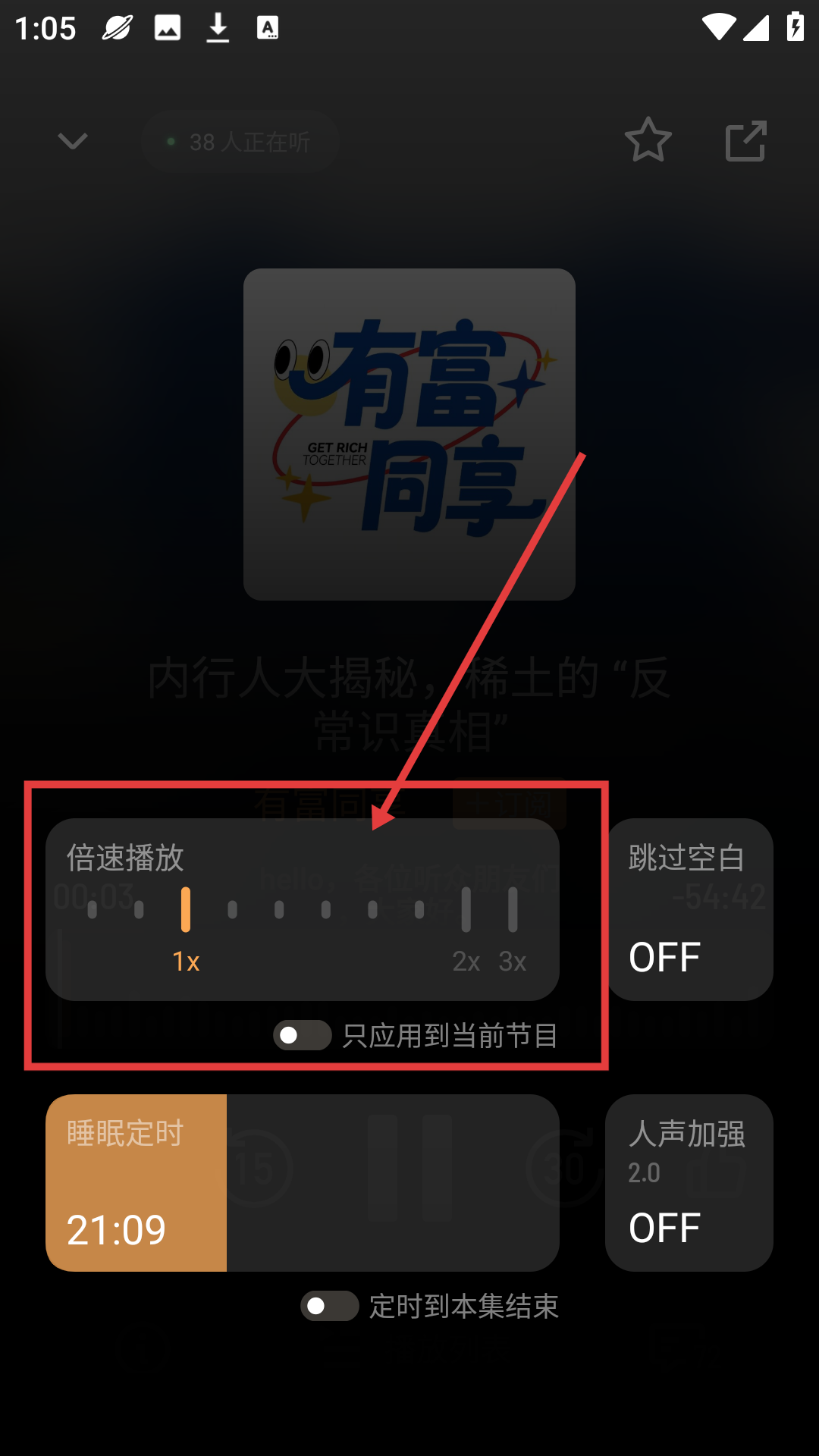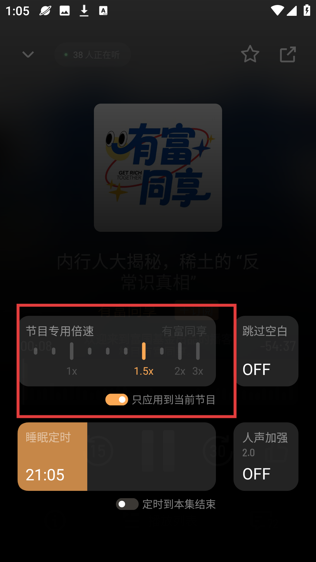 4、选择合适的倍速,如1.5x,并开启“只应用到当前节目”,即可调整该播客的播放速度哦。