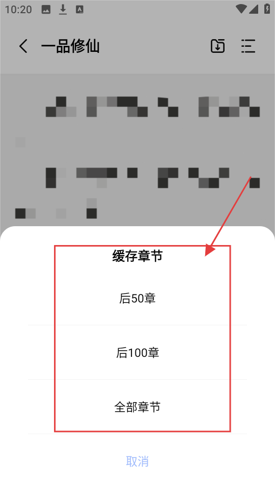 2、点击缓存图标后,会出现【后50章】【后100章】【全部章节】选项,根据需求选择就能缓存对应的章节啦。