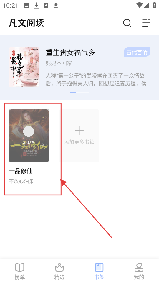 4、在书架界面能看到【一品修仙】的书籍,点击它就能继续阅读或者查看缓存进度,让你随时能看修仙故事哦。