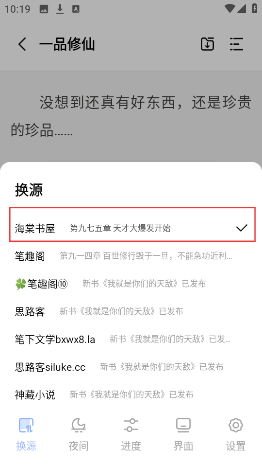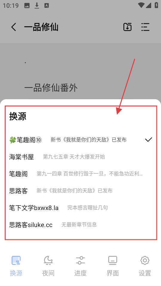 1、在【一品修仙】阅读页面,点击【换源】,可弹出换源列表,选择不同的小说来源啦。