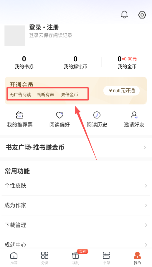 1、注册登录后,前往“我的”页面查看资产和福利,会员服务提供去广告和畅听功能,按需选择是否开通。