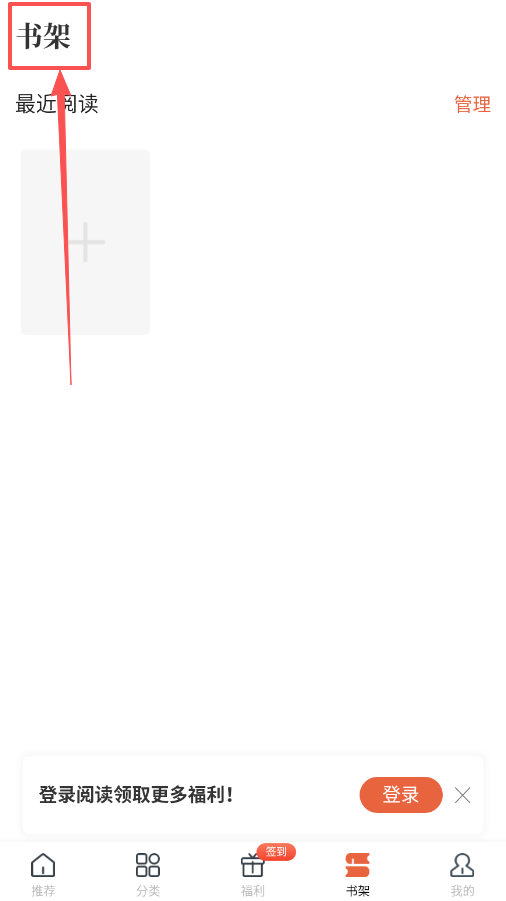 4、阅读历史保存在“书架”里,登录账号可云同步进度,并用“管理”功能对收藏书籍进行排序或删除。
