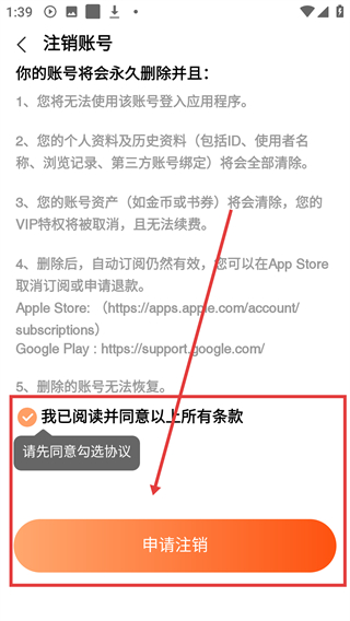 4、在注销账号页面勾选同意条款后,点击【申请注销】即可提交账号注销申请啦。