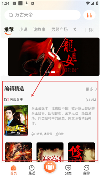 1、在首页,选【编辑精选】里的目标作品,可进入作品详情页,查看内容并准备收听哦。