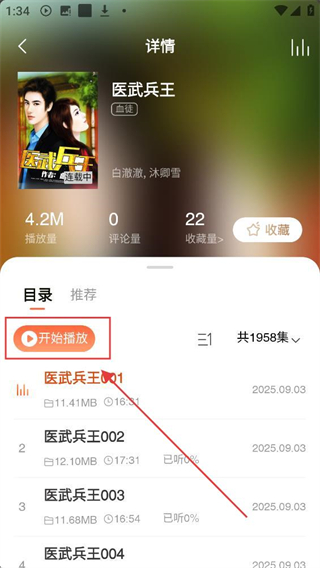 2、进入作品详情页后,点【开始播放】按钮,就能启动音频播放,还能查看集数列表啦。