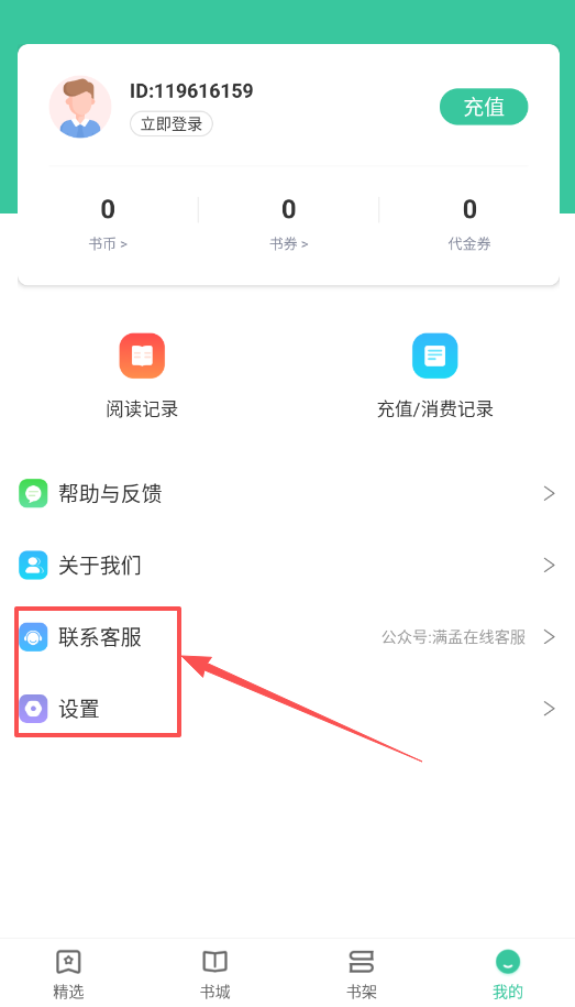 1、使用前先登录账号哦,在“我的”页面查看ID和余额情况,书币不够就点充值按钮,客服和设置功能也放在这个页面。