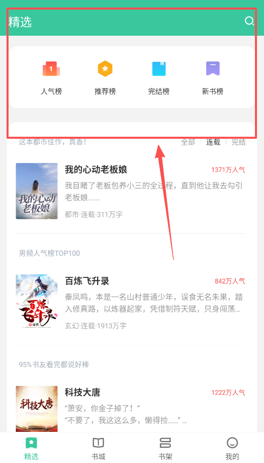 2、想找好看的书不妨逛逛精选页,上面有四大榜单可以切换,下面会推荐类似“我的心动老板娘”这样的作品。