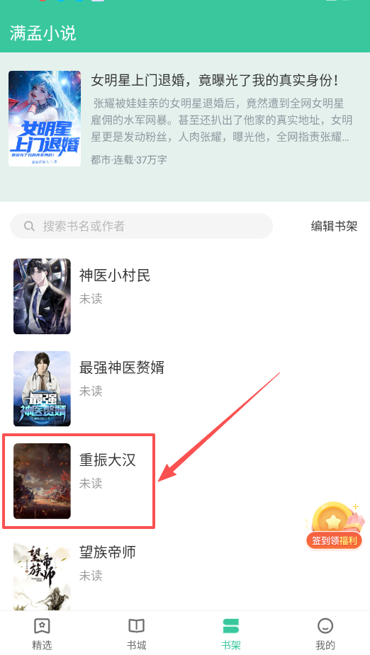 4、书架用于管理你的收藏,通过搜索添加想看的书,加入后像重振大汉这样的作品会显示在这里,方便你随时找到并继续阅读。