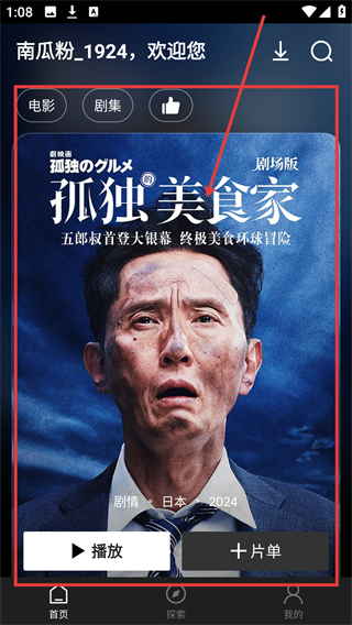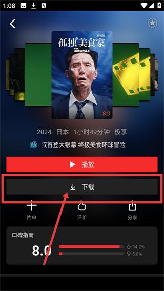 1、在影视平台页面,点击目标影片《孤独美食家》的封面,可进入影片详情页,准备进行下载操作啦。