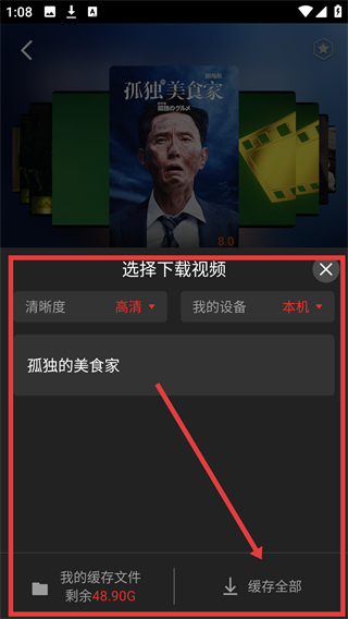 3、在下载设置页面,选择清晰度和设备后,点击【缓存全部】,即可开始影片缓存啦。