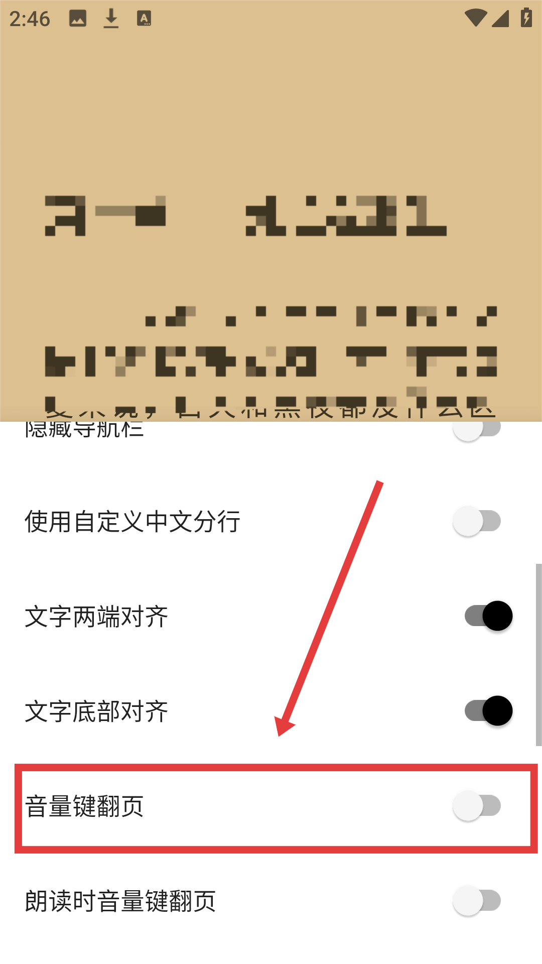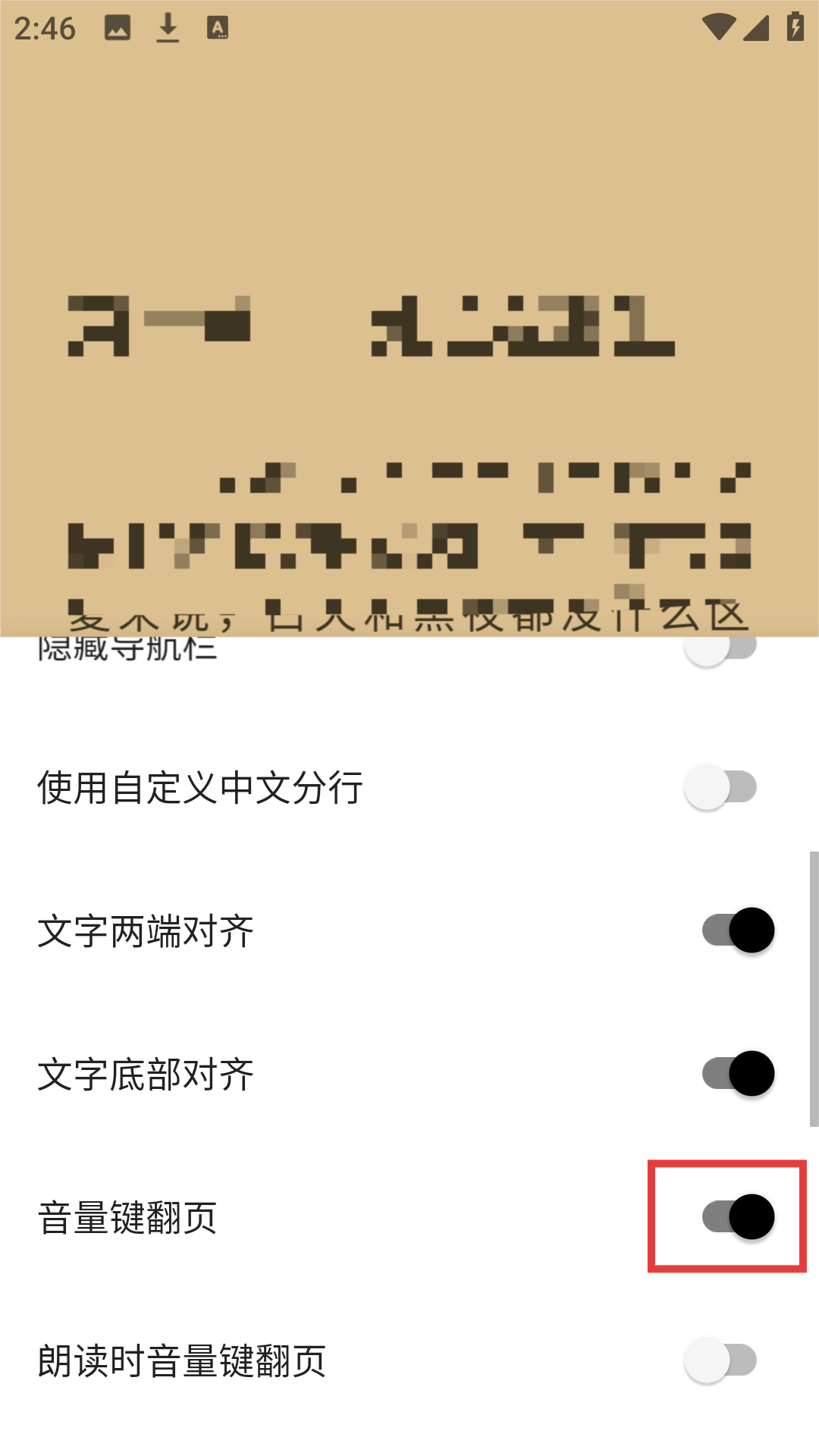 4、打开【音量键翻页】开关,就能用音量键进行翻页操作,阅读更便捷哦。