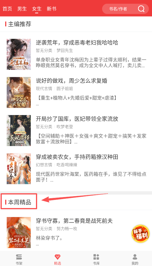 1、首先,进入首页后,想快速找热门新书,可直接点“精选”,这里“主编推荐”和“本周精品”栏目会展示高人气小说的简介和标签供你挑选。