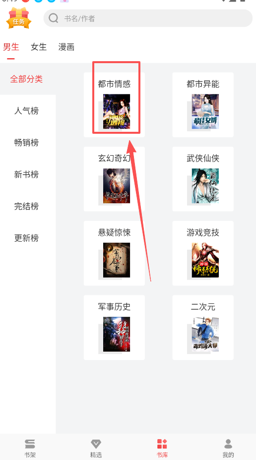 2、其次,若想分类查找或按榜单探索,需点击“书库”,页面顶部可选“男生”或“女生”频道,下方则按“都市情感”、“武侠仙侠”等分类。
