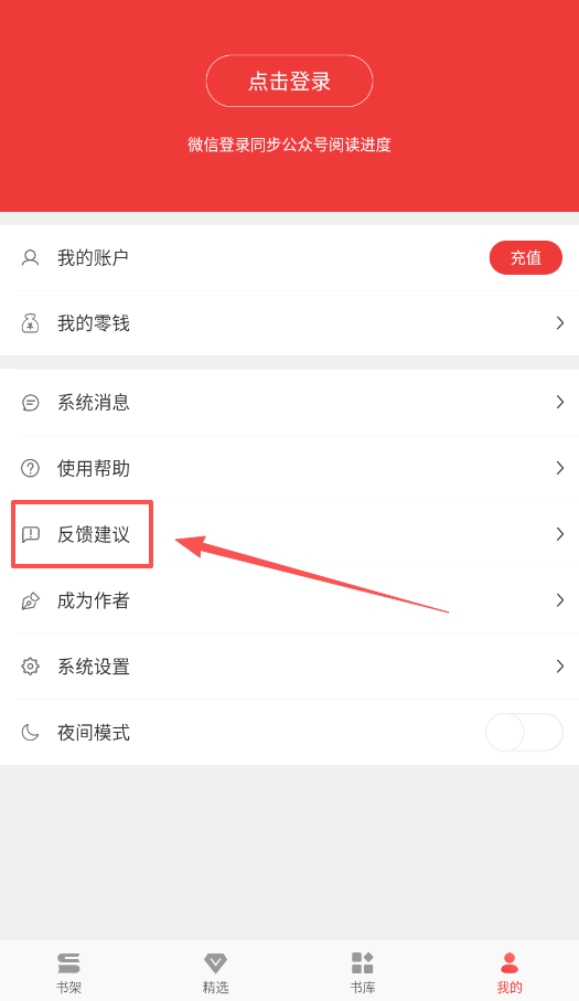 4、最后,个人账户管理需前往“我的”页面。你可在此通过微信登录以同步阅读记录,查看消息、开关夜间模式或提交反馈等操作。