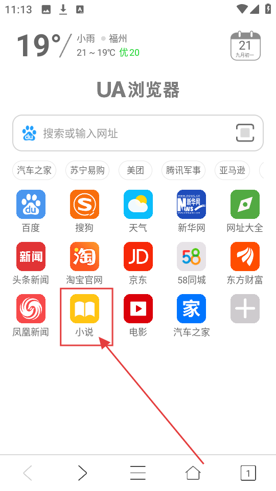 1、打开UA浏览器,点击【小说】图标,进入小说相关页面,准备查找想看的小说啦。