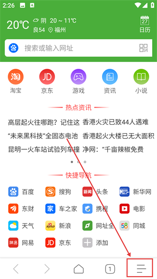 1、在浏览器首页,点底部右侧的菜单图标,能展开功能选项面板,找到各类工具和设置入口哦。