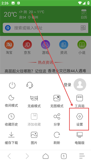 2、展开功能面板后,点【设置】选项能进入设置页面,可调整浏览器的各类配置项啦。