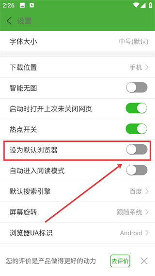 3、在设置页,找到【设为默认浏览器】选项,点它就能进入默认浏览器的设置流程啦。