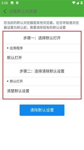 4、进入设置默认浏览器页后,按步骤操作并点【清除默认设置】,就能为设为默认做准备啦。