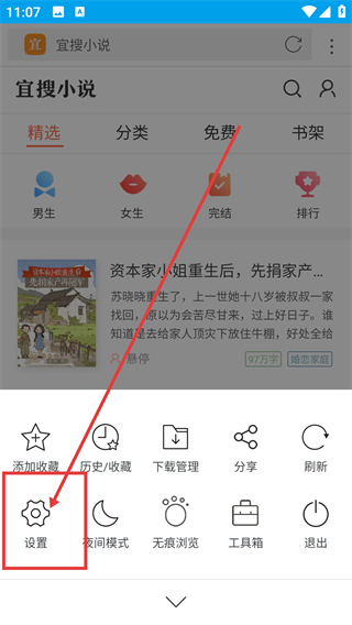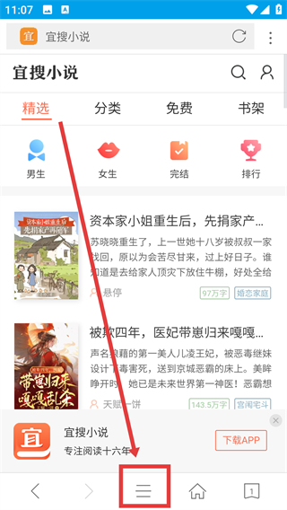 1、在宜搜小说页点底部的菜单按钮,能展开功能选项栏,后续可通过这些选项调整阅读相关设置啦。