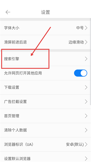 3、在设置页点【搜索引擎】选项,就能展开引擎选择列表,后续可切换不同的搜索工具啦。