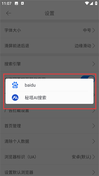 4、展开搜索引擎列表后,可选【baidu】或【秘塔搜索】,切换成自己习惯用的搜索工具哦。