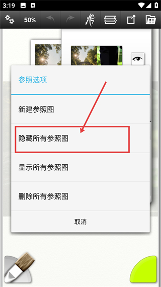 3、打开参照选项菜单后,选择【隐藏所有参照图】,就能暂时把所有参照图都隐藏起来,专注绘画啦。