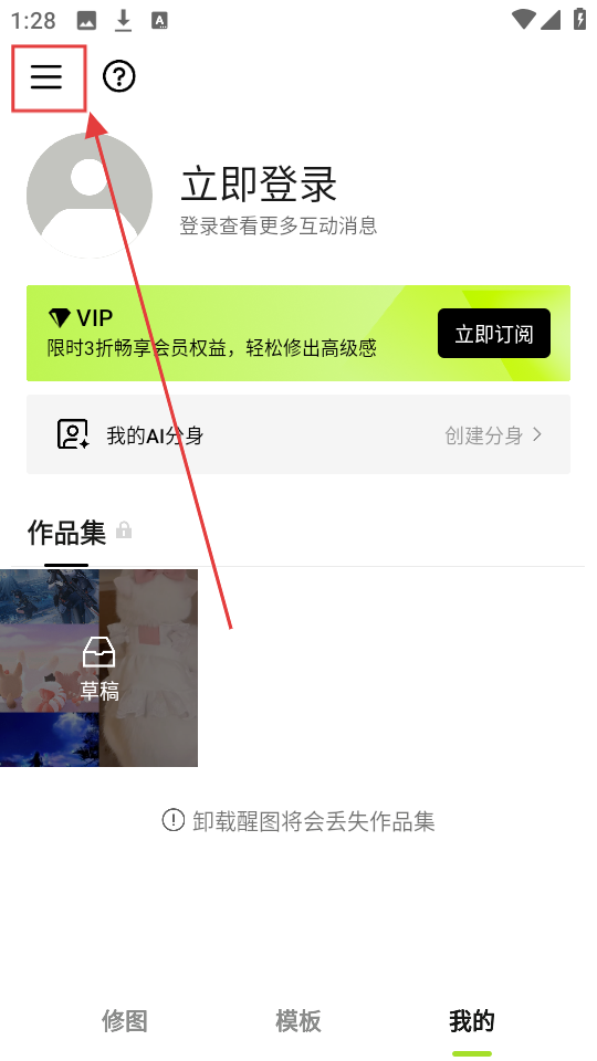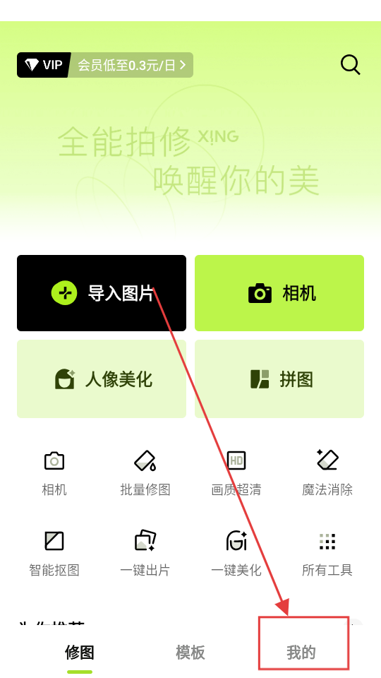 1、在修图页面,点击底部【我的】,可进入个人页面,查看个人相关功能啦。