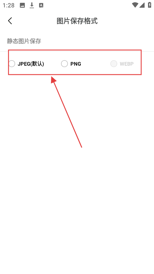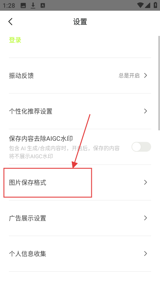 3、在设置页面,点击【图片保存格式】,可进入图片保存格式设置页面啦。