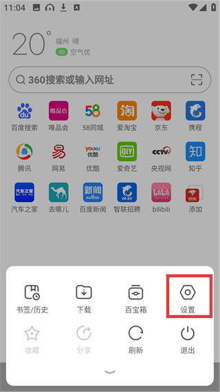 2、在弹出的操作菜单里点【设置】选项,能进入浏览器的设置界面,可调整字体等参数哦。
