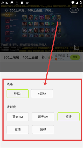 4、在清晰度选择界面选线路和清晰度,如【超清】,即可调整直播画质,获得更好观看体验啦。