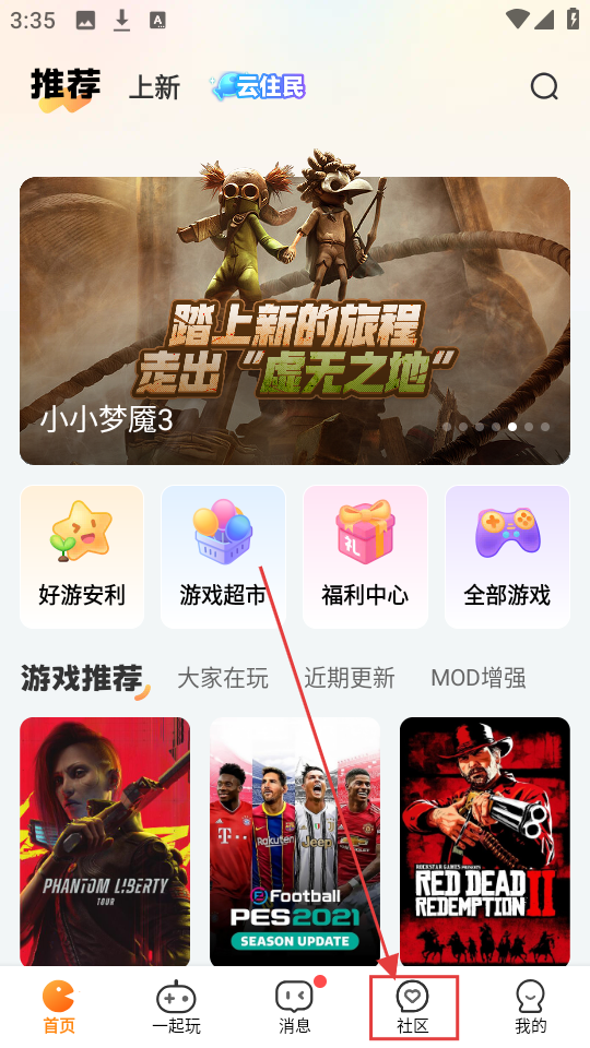 1、若想和玩家交流,点击【社区】按钮,进入社区页面,开启游戏交流之旅。