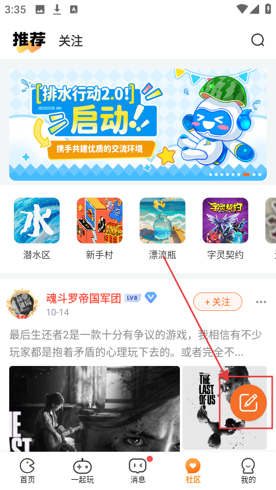 2、在社区页面,看到橙色编辑按钮,点击它进入发帖页面,准备发布内容。
