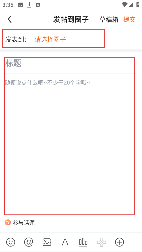 3、在发帖页面,先选择要发表的圈子,再填写标题和内容,完成发帖准备。