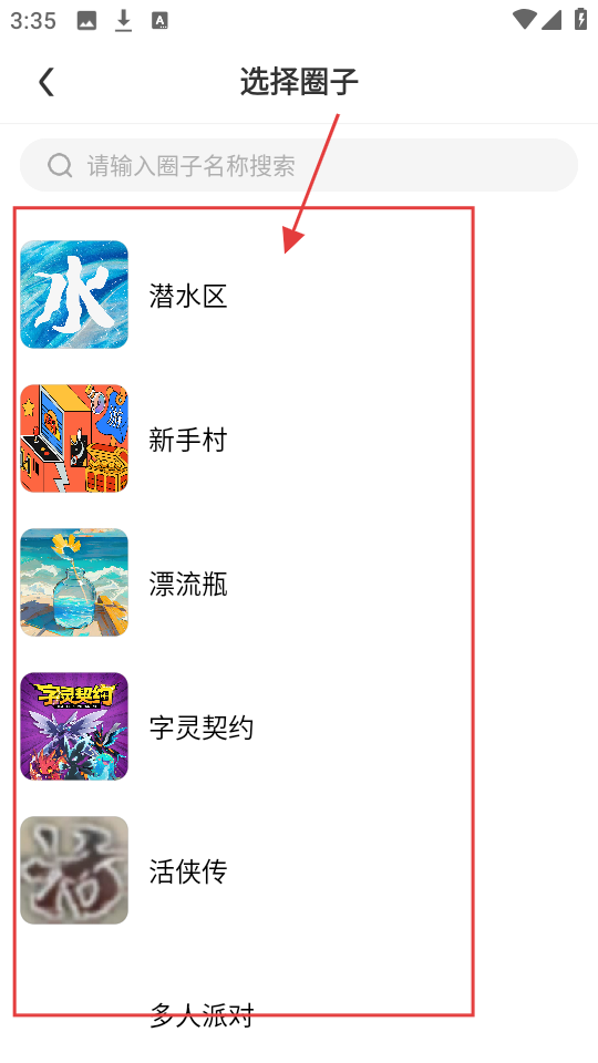 4、进入选择圈子页面,有【潜水区】【新手村】等圈子,选好后就能发表帖子啦。