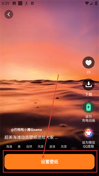 1、在动态壁纸页面,选择喜欢的壁纸(如【超美海滩动态壁纸】),点击其缩略图可进入壁纸详情页,准备设置啦。