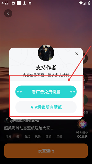 3、在支持作者窗口中,点击【看广告免费设置】按钮,观看广告后就能解锁该壁纸的设置权限啦。