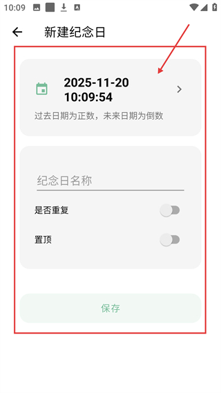 3、在新建纪念日页面填写日期、名称等信息,设置完成后可保存啦。