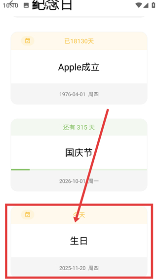 4、保存后新的纪念日会显示在列表中,比如添加的【生日】就会出现在页面里哦。