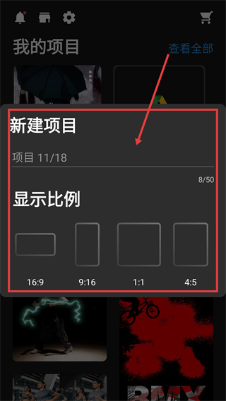2、新建项目时,可选择【显示比例】如16:9、9:16等,设定项目的画面比例啦。
